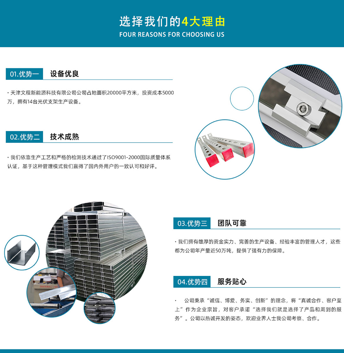 公司是集設計、研發、生產、制造為一體的綜合型企業。公司占地面積20000平方米,注冊資金5000萬元整。公司坐落于華北鋼鐵重鎮--大邱莊,距天津市區50公里、鄰104和205國道及京滬高速,交通十分便捷。 本公司擁有三個生產車間,其中兩個冷彎型鋼車間,一個鋅鋁鎂型鋼車間,擁有自動冷彎成型機10條,自動數控沖孔機10條以及焊接加工等設備。主要生產產品有:太陽能光伏支架、各種規格的C/Z/U型鋼、抗震支架、管廊支架及整套配件等。